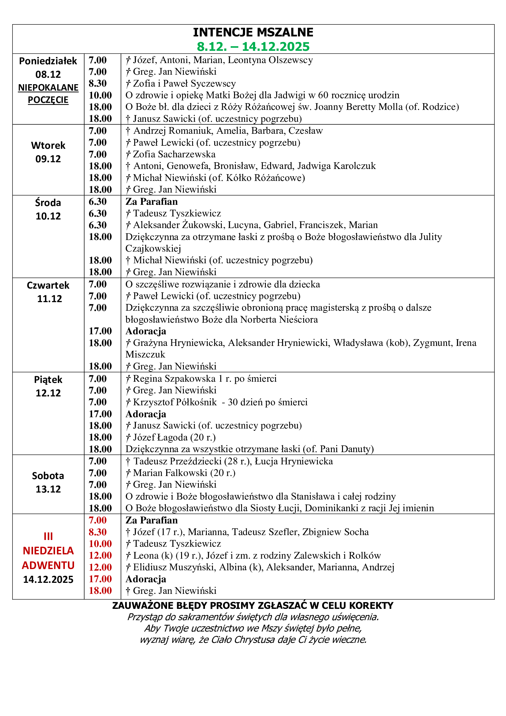 12. W ubiegłym tygodniu zmarła ś. HENRYKA ŻUKOWSKA. Rodzinie składamy wyrazy współczucia a zmarłą polećmy naszym modlitwom: „Wieczny odpoczynek racz Jej dać Panie, a światłość wiekuista niechaj Jej świeci na wieki. Niech odpoczywa w pokoju wiecznym. Amen”.