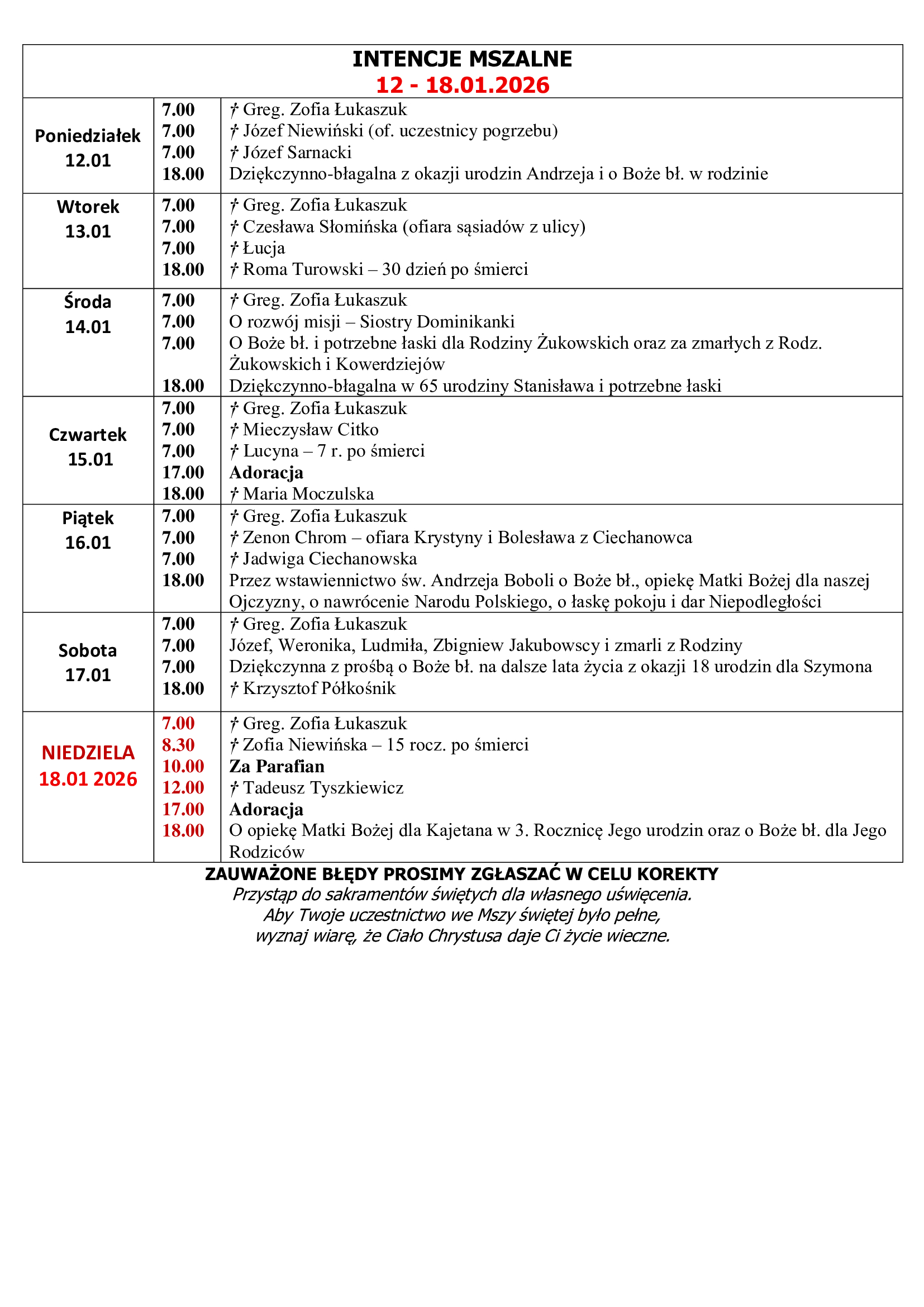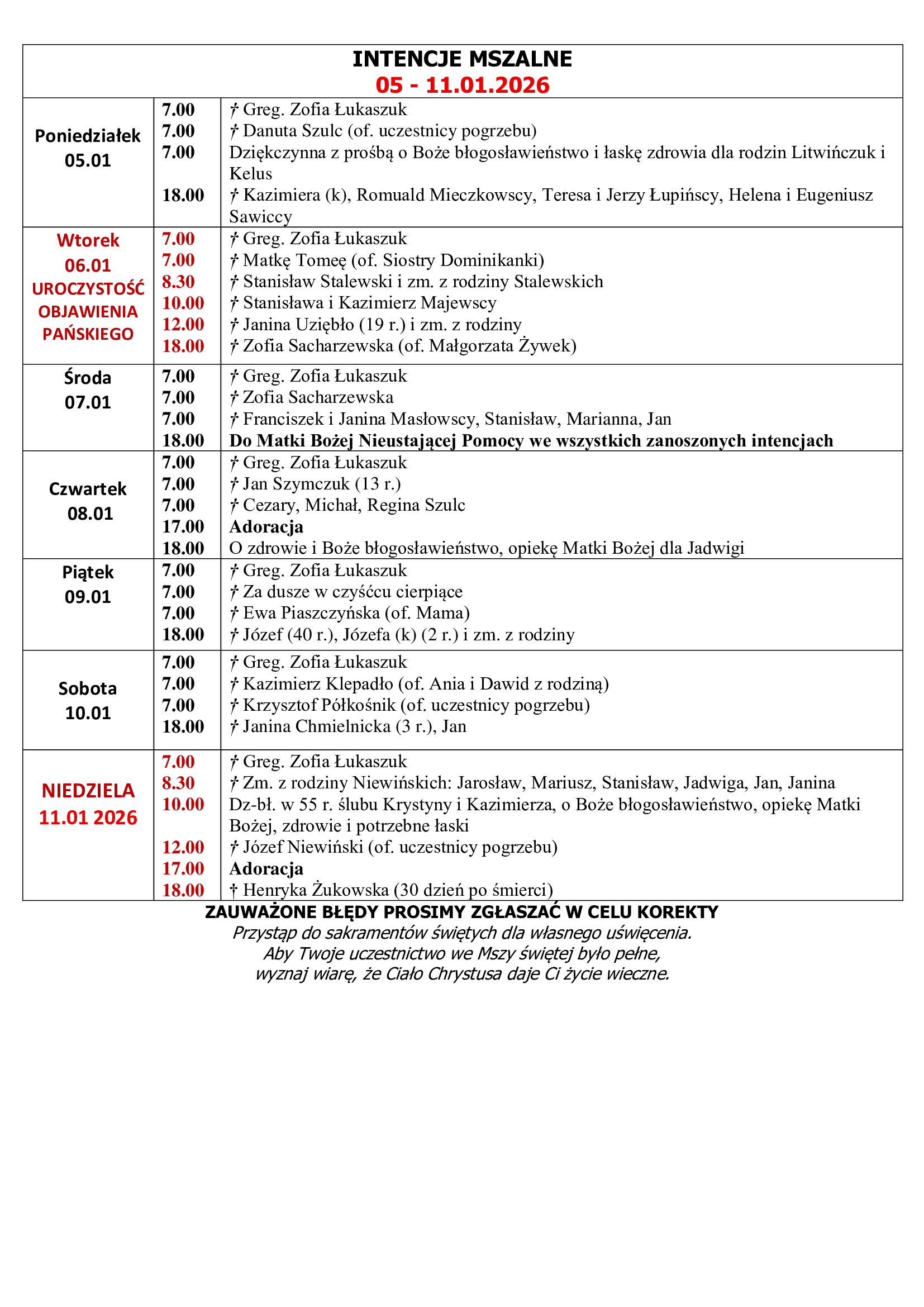 6. W najbliższą niedzielę (11.01.) Święto Chrztu Pańskiego i zakończenie okresu Narodzenia Pańskiego. Módlmy się dziękując za otrzymany chrzest święty i pamiętajmy o zobowiązaniach wypływających z przyjęcia tego sakramentu.